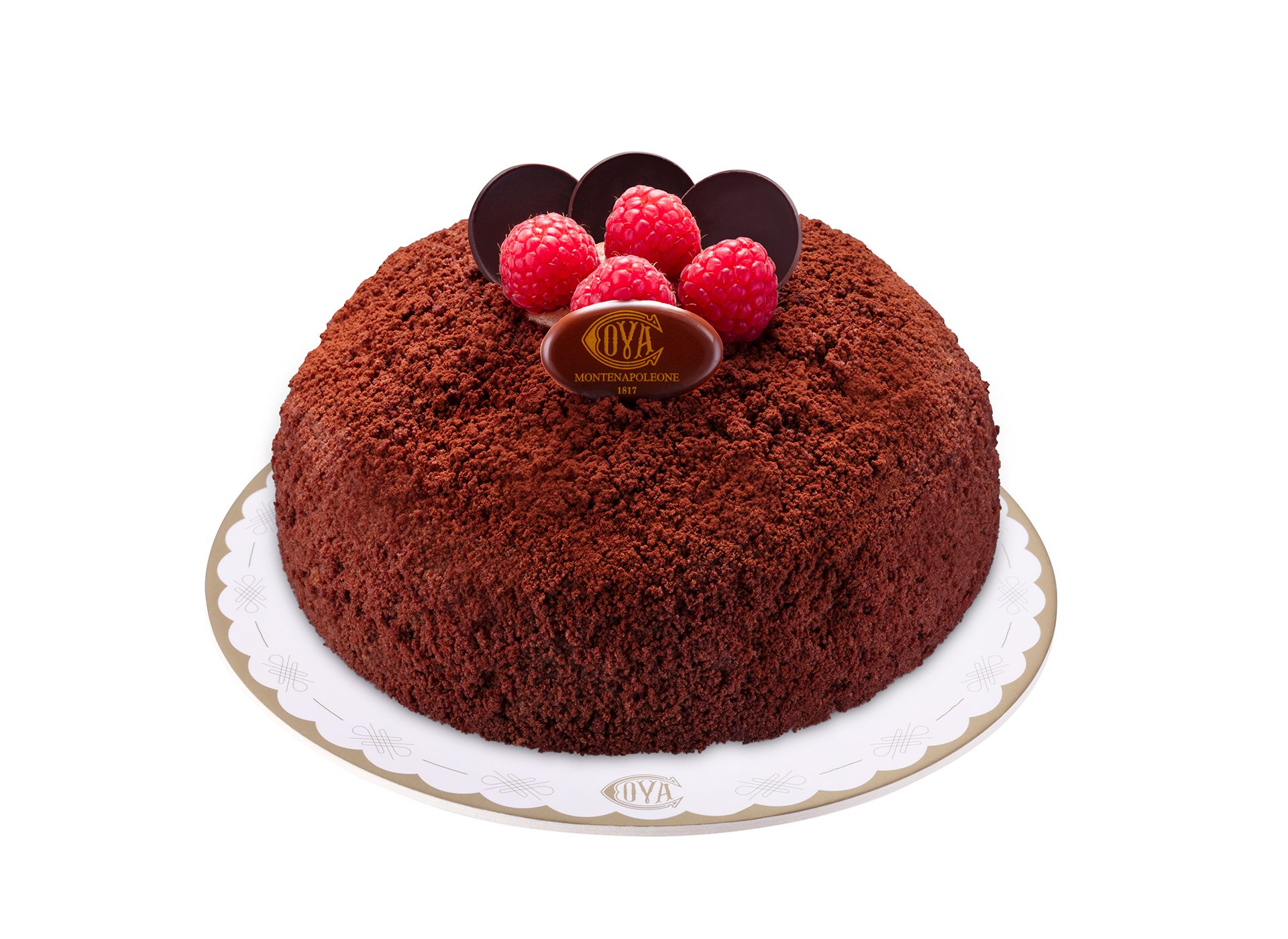 Layers of Sacher sponge filled with chocolate and Gianduia (hazelnut chocolate) cream, topped with Sacher chocolate crumbs and cocoa powder